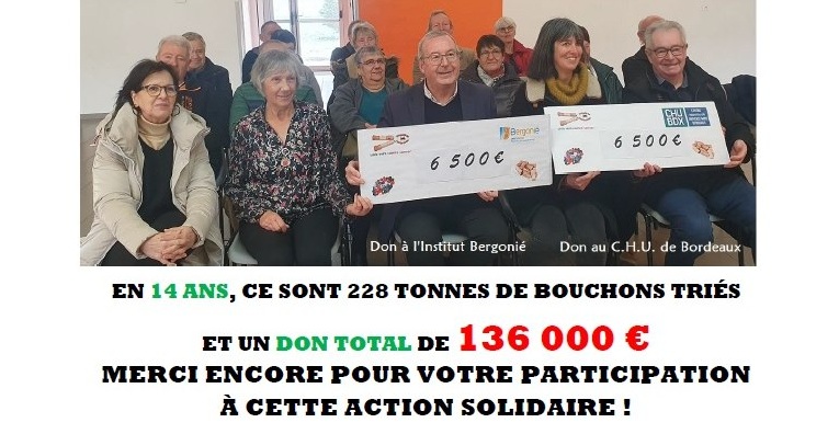 Bon soutien pour la cause cancer, pour la recherche pour l'Institut Bergonié, pour l'aide aux familles pour le CHU de Bordeaux; tout çà à partir des collectes des bouchons plastique-synthétiques-liège.